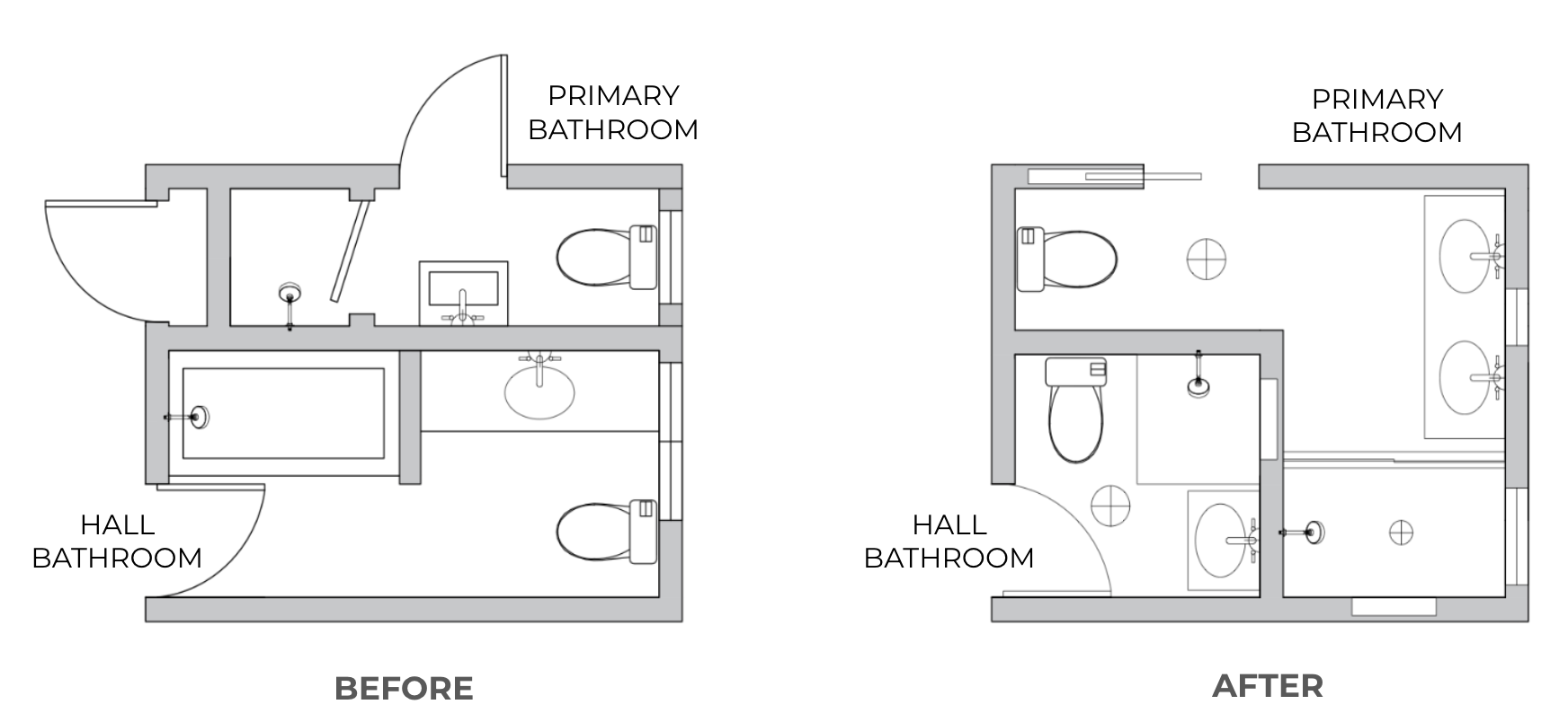 As you can see from the floor plans below, the new bathrooms are now functional and flow nicely. Scroll down to see before images. You can find after images here: Harper project.